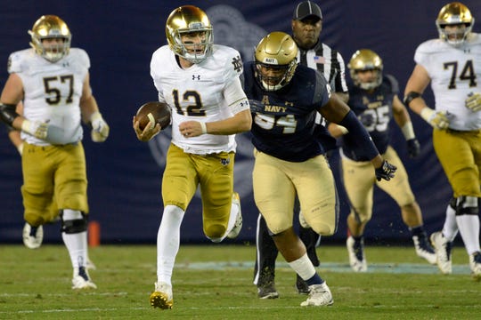 Notre Dame quarterback Ian Book runs the ball against Navy. (Photo: Jake Roth, USA TODAY Sports)