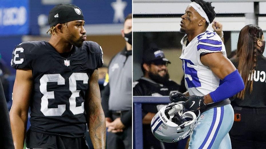 Las Vegas Raiders safety Roderic Teamer (33) leaves the field after being ejected following a fight that included Teamer and Dallas Cowboys’ Kelvin Joseph in the second half of an NFL football game in Arlington, Texas, Thursday, Nov. 25, 2021. (AP Photo/Michael Ainsworth)