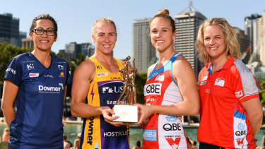 Prize fighters: Sunshine Coast Lightning head coach Noeline Taurua, captain Laura Langman, NSW Swifts captain Paige Hadley and head coach Briony Akle pose with the Super Netball trophy.Credit:AAP