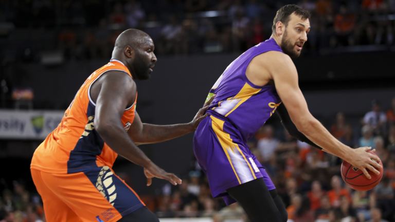 Key men: Andrew Bogut of the Kings, right, tries to get the better of Cairns’ Nathan Jawai.Credit:AAP