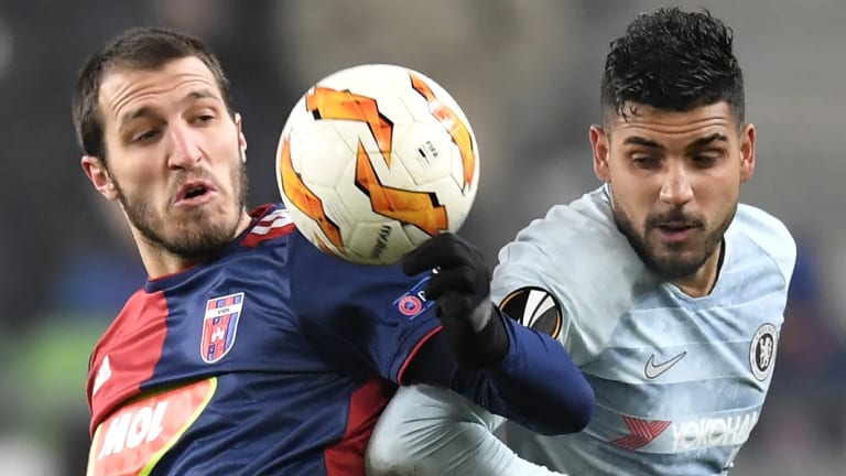 Vidi’s Marko Scepovic (left) battles Chelsea’s Emerson Palmieri.Credit:AP