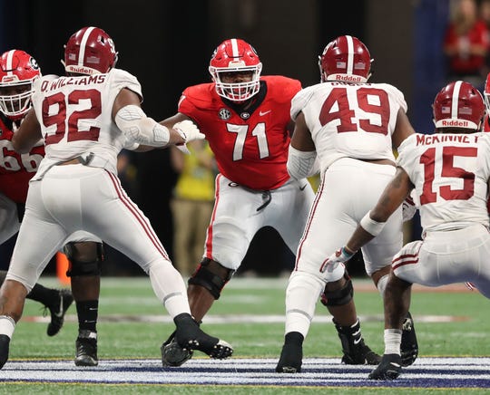 Georgia offensive lineman Andrew Thomas (71) blocks against Alabama during the 2018 SEC championship game. (Photo: Jason Getz, USA TODAY Sports)