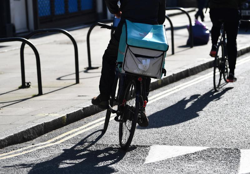 FILE PHOTO: A courier for food delivery service Deliveroo rides a bike, as as the spread of the coronavirus disease (COVID-19) continues, in London, Britain, March 24, 2020. REUTERS/Dylan Martinez