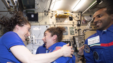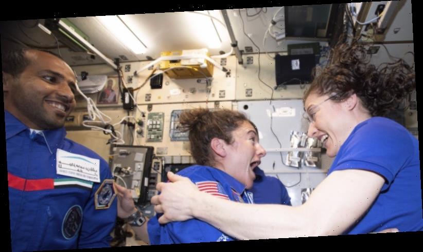 Christina Koch and Jessica Meir greet each other on the international space station. Credit:NASA