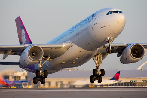 A Hawaiian Airlines Airbus A330 takes off for Honolulu from Los Angeles International Airport on Sept. 23, 2017. (Photo: Jeremy Dwyer-Lindgren, special for USA TODAY)