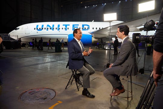 United Airlines CEO Oscar Munoz sits for a TV interview after the unveiling of the new livery. (Photo: Tyler R. Mallory, for USA TODAY)
