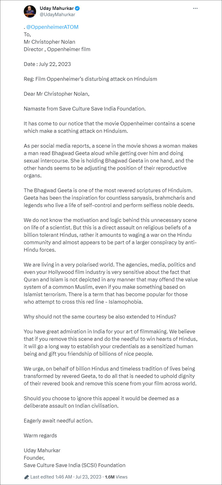 The 52-year-old filmmaker was called out by Indian officials, through a journalist and government-appointed information commissioner named Uday Mahurkar, via Twitter on Sunday, July 22. In a lengthy tweet, Uday wrote, “It has come to our notice that the movie Oppenheimer contains a scene which make a scathing attack on Hinduism.”