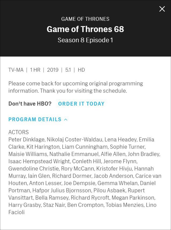 Shared by Watchers on the Wall, the list was discovered as a fan were looking for future episode URLs on the HBO website, which allowed access to the page created for the episode. The site offers the long cast of characters for the hour-long episode.