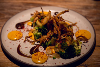 Char-Grilled Broccoli, Chinkiang Vinegar with Salted Egg Yolk at Restaurant Scully St James’s.Credit:Liliana Zaharia
