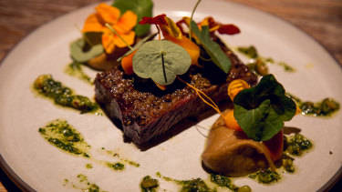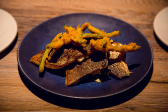 Beef short-rib pastrami, butterscotch horseradish, pistachio pesto at London’s Restaurant Scully.Credit:Liliana Zaharia