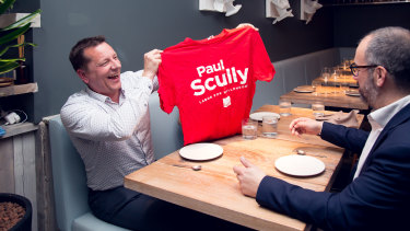 Wollongong’s Paul Scully (left) has brought along a T shirt for his UK namesake.Credit:Sydney Morning Herald