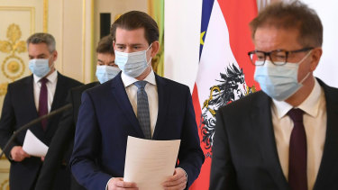Austrian Chancellor Sebastian Kurz, centre, arrives for a coronavirus news conference with other ministers in Vienna.Credit:AP