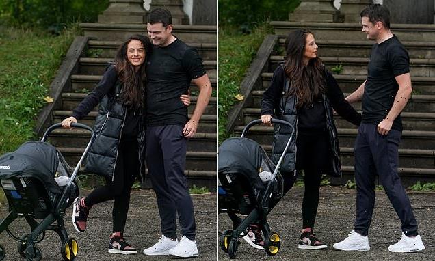 Disgraced Adam Johnson, 34, and partner Stacey Flounders, 31, are all smiles as they embrace during a walk with their newborn son Arley and daughter Ayla, aged six