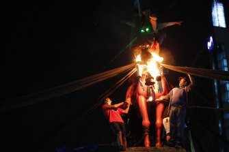 Demonstrators burn a doll depicting General Augusto Pinochet on a horse, on the day of the referendum.Credit:AP