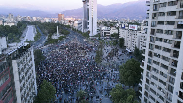 Anti-government protesters gather on Plaza Italia, Santiago, on the day Chileans voted in a referendum to decide whether the country should replace its dictatorship-era constitution.Credit:AP