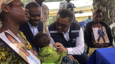 WHO Director-General, Dr Tedros Adhanom Ghebreyesus and DRC Ministry of Health, Dr Oly meet widows who lost their husbands to conflict during a visit to an Ebola treatment centre in Butembo, in the Democratic Republic of the Congo, on Saturday.Credit:AP