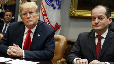 President Donald Trump pictured last year with Labor Secretary Alexander Acosta, who has attracted attention for his role in the case of Jeffrey Epstein.Credit:AP