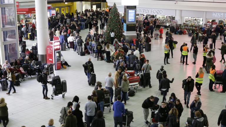 People queue at Gatwick airport, near London on Thursday.Credit:AP