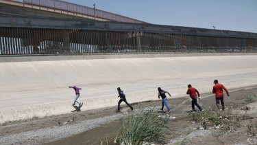 Migrants cross the Rio Bravo illegally to surrender to the American authorities, on the US – Mexico border between Ciudad Juarez and El Paso.Credit:AP