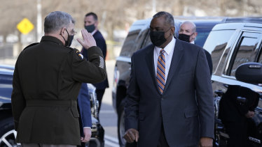 Defence Secretary Lloyd Austin, right, is saluted by Chairman of the Joint Chiefs of Staff Mark Milley as he arrives at the Pentagon.Credit:AP