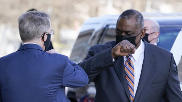 Defence Secretary Lloyd Austin, right, greets Deputy Secretary of Defence David Norquist as he arrives at the Pentagon.Credit:AP
