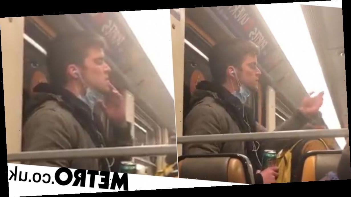 The passenger was on a Belgian subway train when he was filmed lowering a face mask, putting two fingers into his mouth and then rubbing the pole up and down.