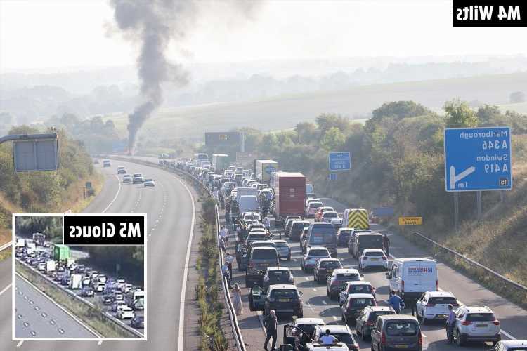 DRIVERS are stuck in miles of tailbacks after the M4 was brought to a standstill by a fire, and a sinkhole opened up on the M5 causing chaos.
