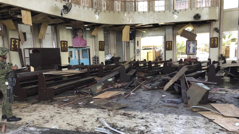 A soldier views the site inside a Roman Catholic cathedral in Jolo, the capital of Sulu province in the southern Philippines after two bombs exploded on Sunday.Credit:Wesmincom/AP