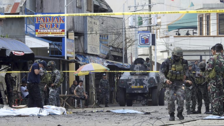 Police investigators and soldiers attend the scene in Jolo on Sunday.Credit:AP