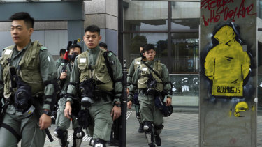 Riot policemen patrol near the government headquarters in Hong Kong on Tuesday.Credit:AP