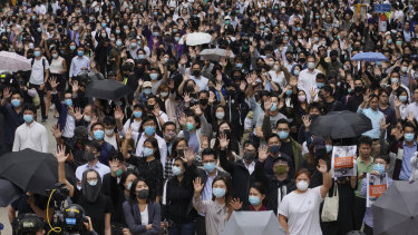 Protesters hold up their hands to represent their five demands as protests continue in Central, Hong Kong, at lunchtime on Tuesday.Credit:AP