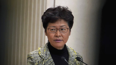 Hong Kong Chief Executive Carrie Lam speaks during a press conference at the government headquarters in Hong Kong on Tuesday.Credit:AP