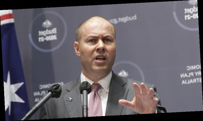 Treasurer Josh Frydenberg addresses the media at his budget press conference in Canberra.Credit: Alex Ellinghausen