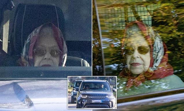 The 95-year-old monarch wore a pink headscarf as she sat in the passenger seat of a Range Rover while she was driven around the Norfolk estate.