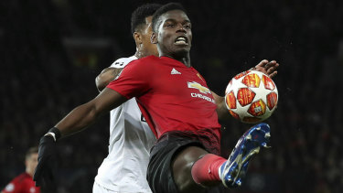 Paris Saint-Germain’s Presnel Kimpembe and Manchester United’s Paul Pogba battle for the ball during the Champions League round of 16 soccer match between Manchester United and Paris Saint Germain at Old Trafford stadium in Manchester, England, on February 12.Credit:AP