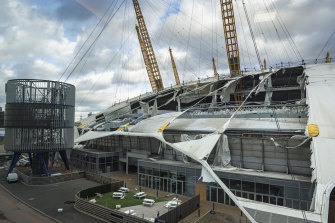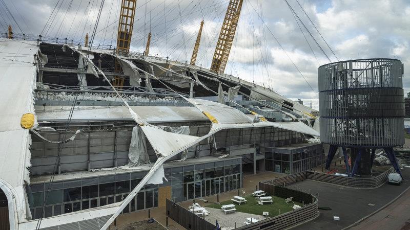 Winds ripped the roof off London’s O2 Arena, formerly known as the Millennium Dome.Credit:Getty Images