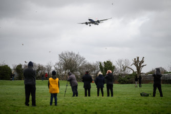 Plane-spotters under the Heathrow Airport flightpath filmed live as plane after plane came in for bumpy landings.