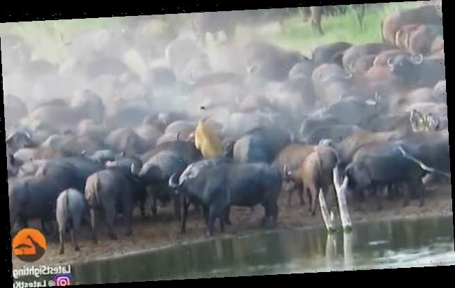 Stampeding water buffaloes trample a lioness to death before tossing her around after she became separated from her pride in South Africa