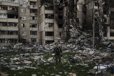 A Ukrainian serviceman walks amid the rubble of a building heavily damaged by multiple Russian bombardments near a frontline in Kharkiv, Ukraine.Credit: