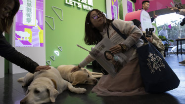 A Hong Kong student pats Taiwanese President Tsai Ing-wen’s dogs during a visit to the campaign headquarters for the Democratic Progressive Party in Taipei on Thursday.Credit:AP