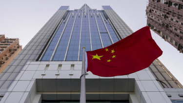 The Chinese flag flutters in the breeze outside China’s liaison office building in Hong Kong.Credit:AP