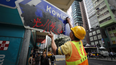 A worker cleans a road sign vandalised by protesters in Causeway Bay, Hong Kong.Credit:AP