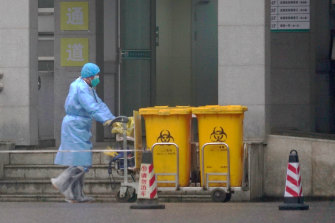 A staff member moves bio-waste containers past the entrance of the Wuhan Medical Treatment Center in Wuhan, China, where some people infected with a new virus are being treated.Credit:AP