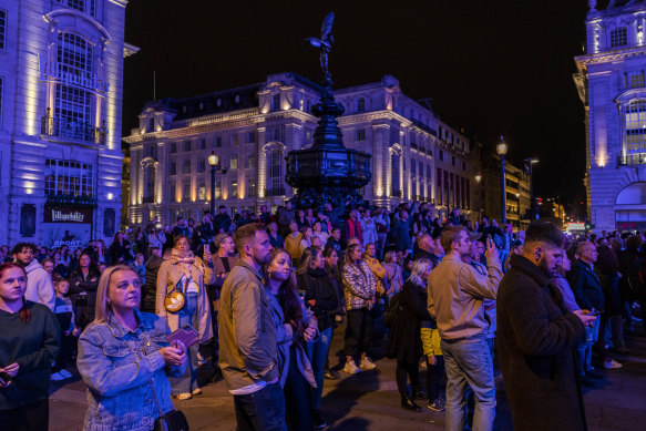 A London crowd observes a national minute’s silence in honour of the late Queen Elizabeth II on Sunday night.Credit:AP