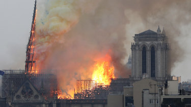 Notre Dame Cathedral spire on the cusp of collapse. Credit:AP